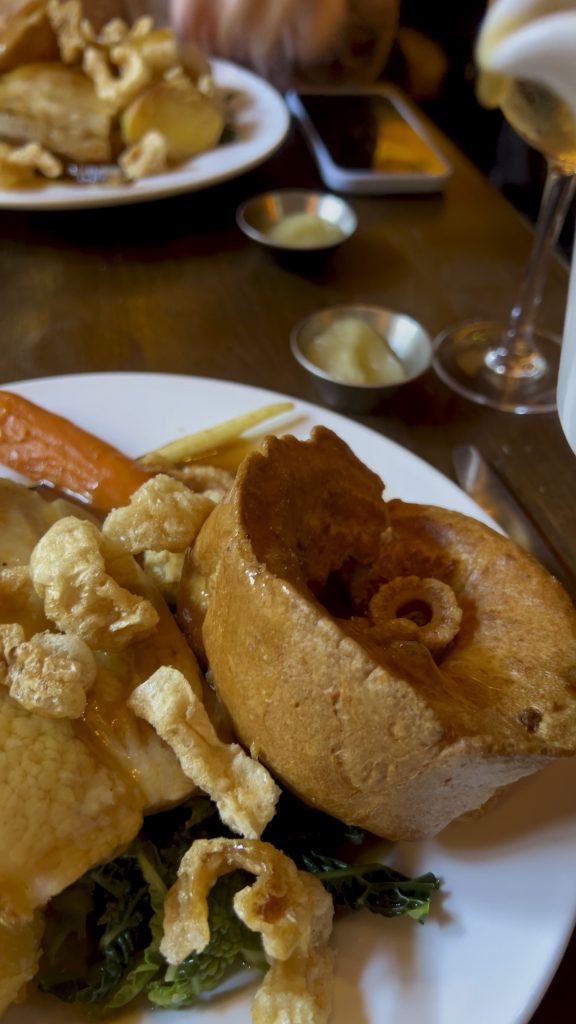 The roast features a perfectly cooked meat, crispy roast potatoes, and Yorkshire puddings. You have the choice between Hereford beef, Duroc pork, White Cobb chicken or Suffolk lamb shoulder and they even have a vegan option. We had the pork belly mainly for the crackling.