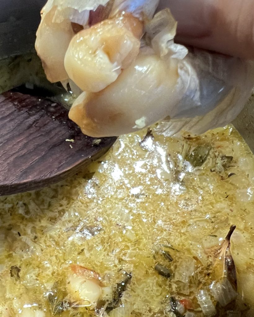 Remove the bones from the soup and add the coconut milk and marrow. Squeeze the roasted garlic out of the bulb and into the soup.