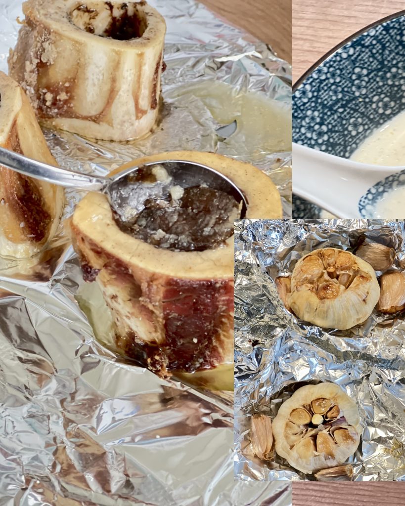 Place the marrow bones and the garlic in the oven. Remove the bones after 20 minutes and leave the garlic in for an extra for 15 minutes.