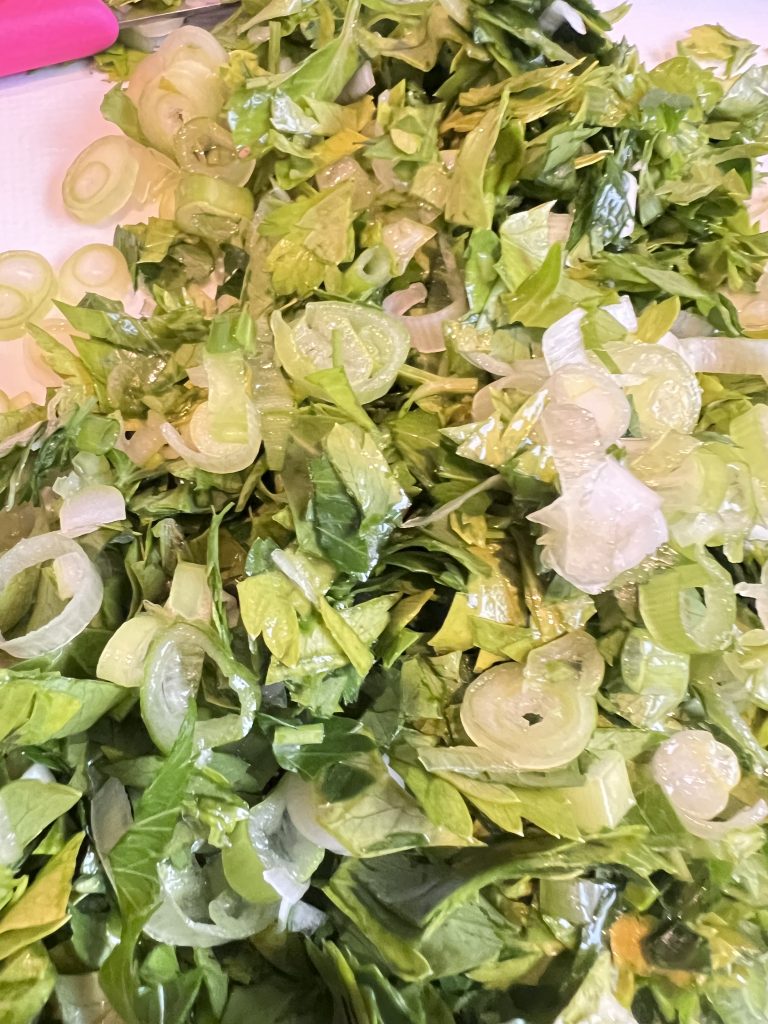 Wash the parsley and spring onions, then dry them and roughly chop them up together.