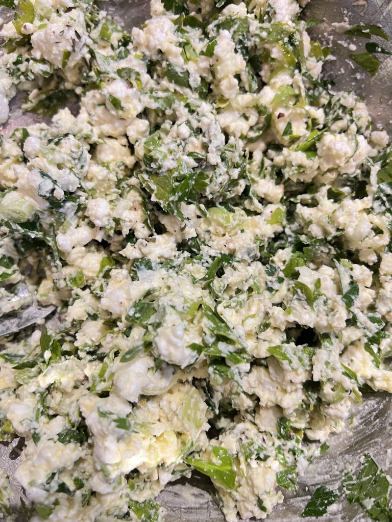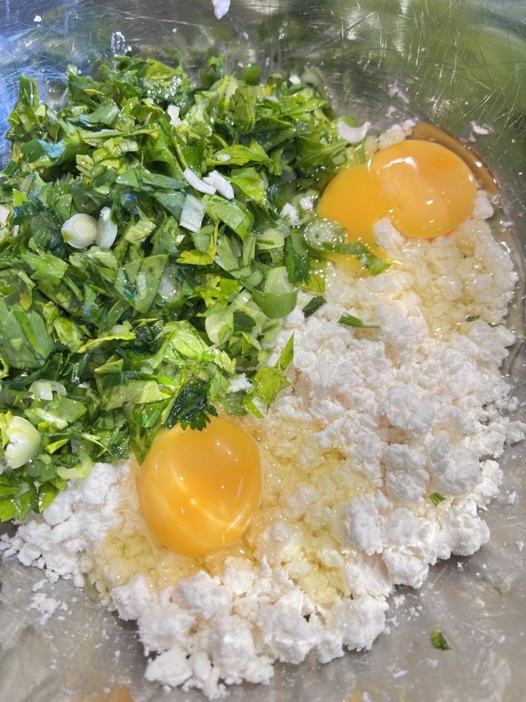 Put the feta in the bowl and crumble it with your fingers, then add the 2 eggs and the chopped up herbs. Sprinkle the za’atar and add some pepper. (no salt the feta covers that)
