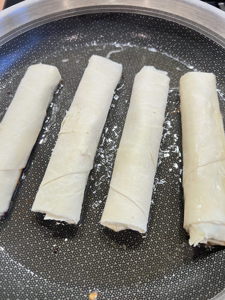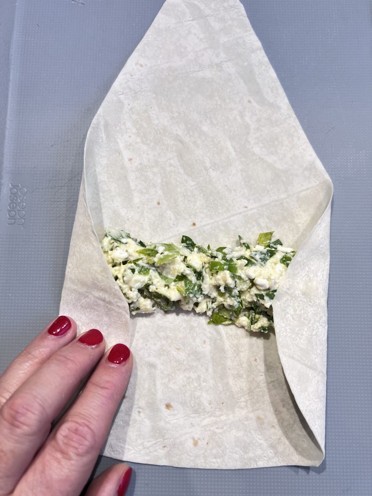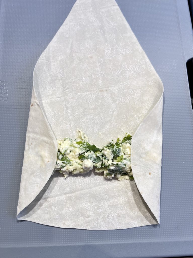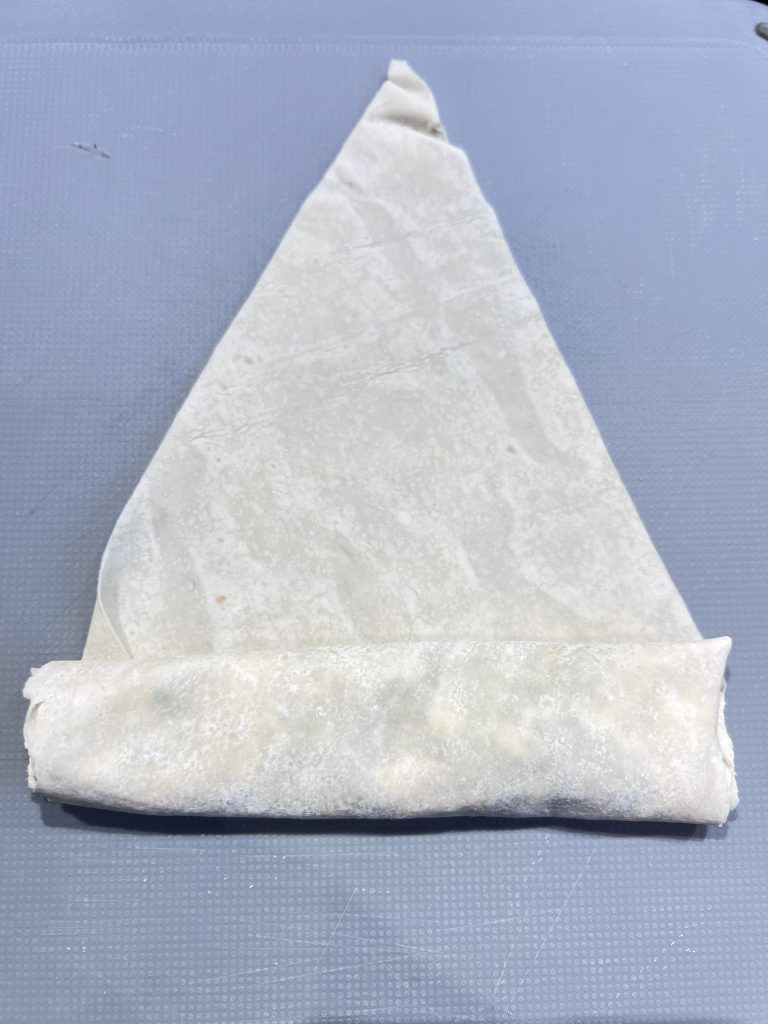Put a large spoonful of your mixture on the pastry like shown on the photo. Then close the pastry on both sides and roll. To make the end stick, all you need is to dip in a glass of water.