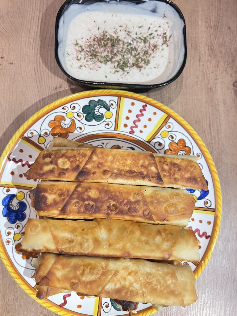 I stuff them with creamy feta, lots of flat-leaf parsley, spring onions, and a good sprinkle of za’atar, then roll them tightly in filo before frying them gently in vegetable oil until golden and flaky. The magic, though, is in the dipping sauce, tangy yogurt with lemon and more za’atar. It’s fresh, zesty, and just the right contrast to the salty filling. By the way that lovely plate comes from Big Mamma, they are now selling them!