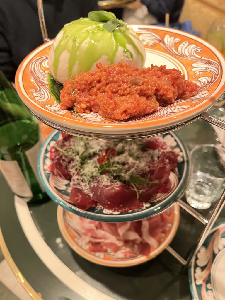 You must order the classic torre dei prodotti, where you get to taste A basic tower of fresh products to share : Burrata al tartufo, Prosciutto di Parma, bresaola, arugula, parmesan and brioche.