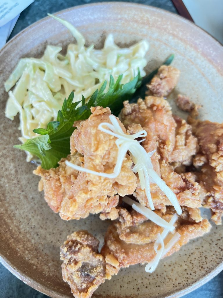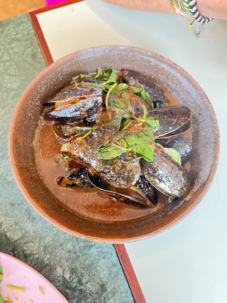 I went for lunch with my ex-colleagues and shared a spread that turned into a little feast: spicy eggplant skewer, mussels with a twist, a zingy yum khung top salad, top man corn, and the special karaage chicken, golden, crunchy, and dangerously moreish. We also shared a dessert, sticky rice with white peaches.