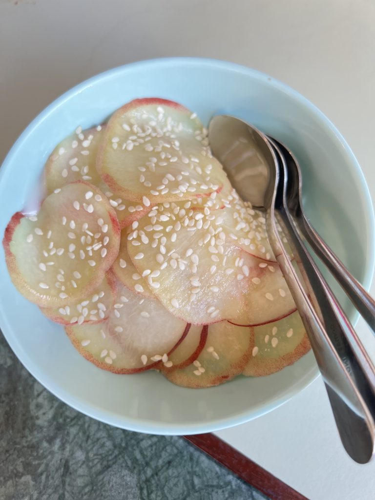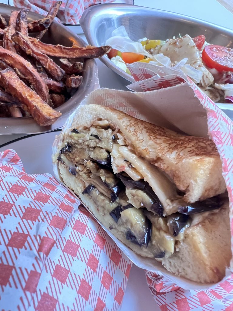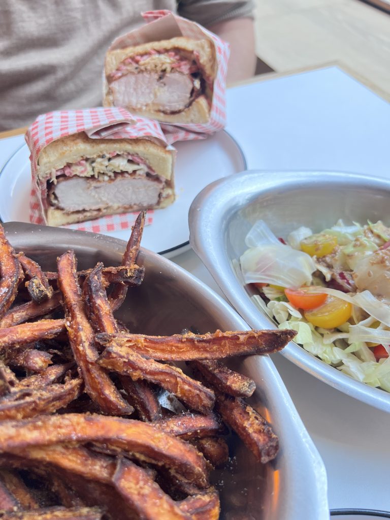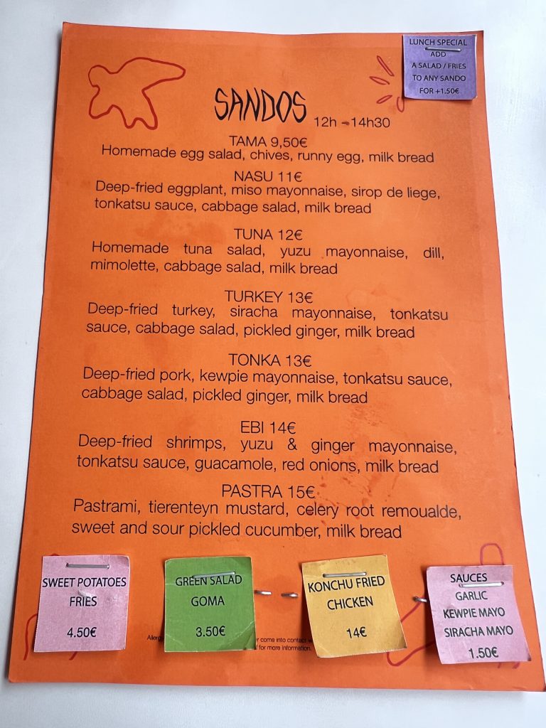 On the menu, at lunchtime, you have the choice of sandos ‘types of sandwiches’, a side dish of either sweet potatoes fries or a green salad. In the evening, you’ll find a mix of favourites like bao buns, noodle bowls, gyoza, and creative small plates that change with the season. Dishes are fresh, flavourful, and designed for sharing, so you can try a little bit of everything.