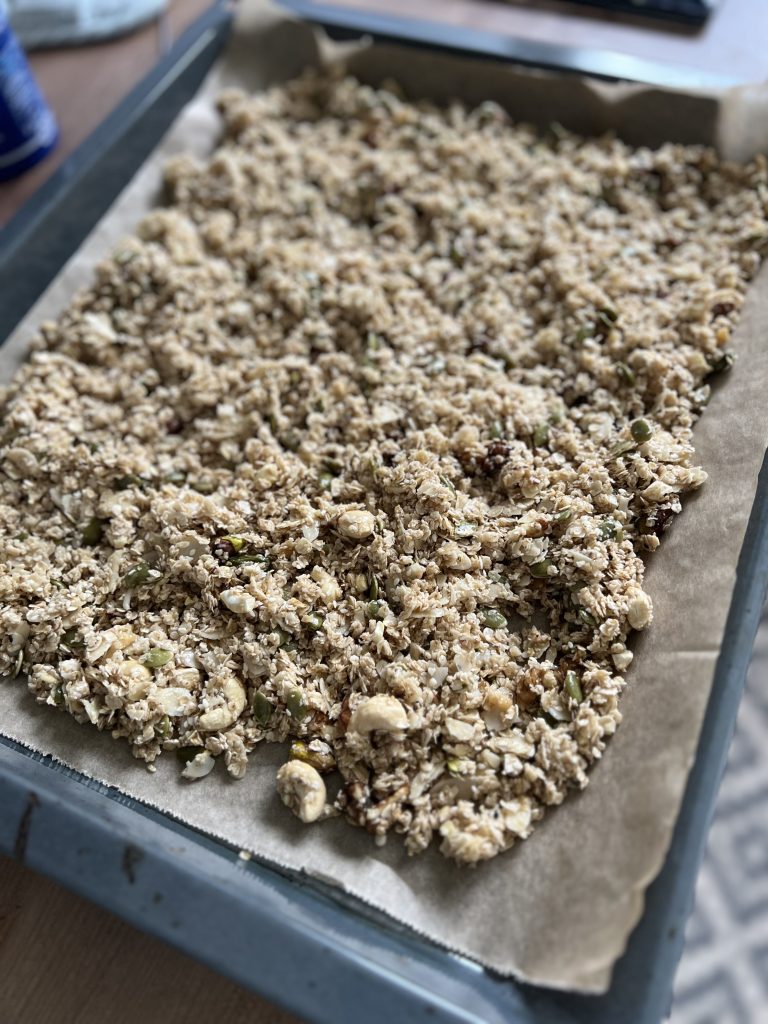 Stir it all together to make a consistent paste. Spread the granola paste evenly on a baking sheet.