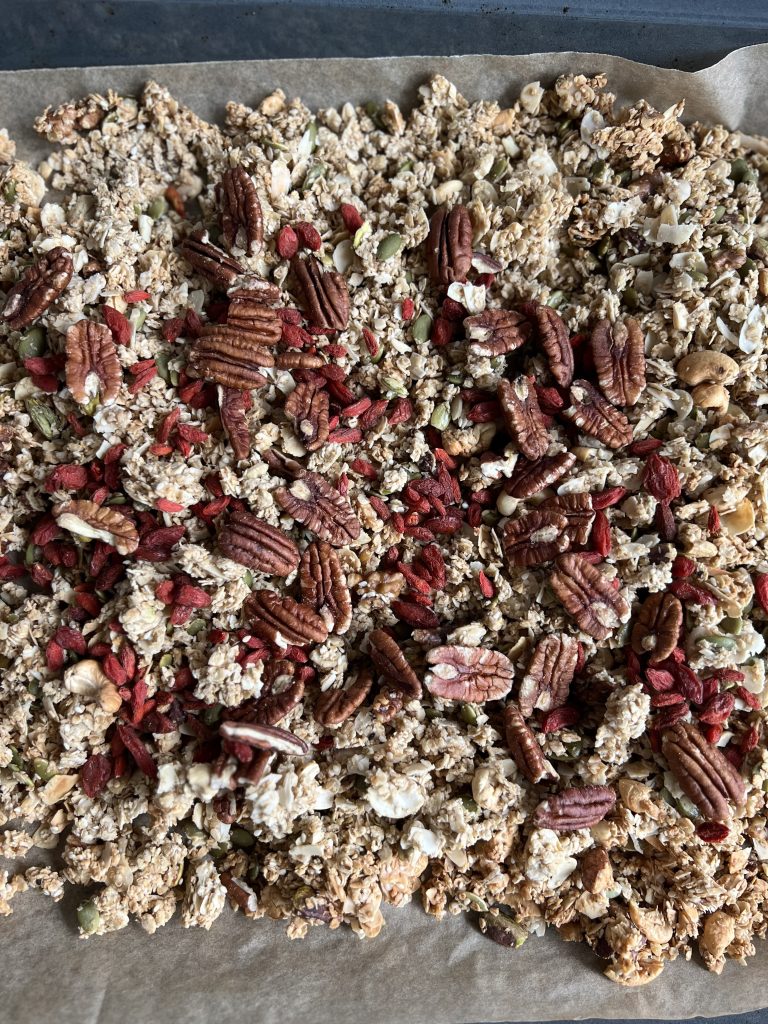Put in the oven for 40 minutes and make sure you stir it from time to time until it’s golden syrup colour. Don’t worry if it seems soft in some places, it will turn crunchy after it’s cooled down.