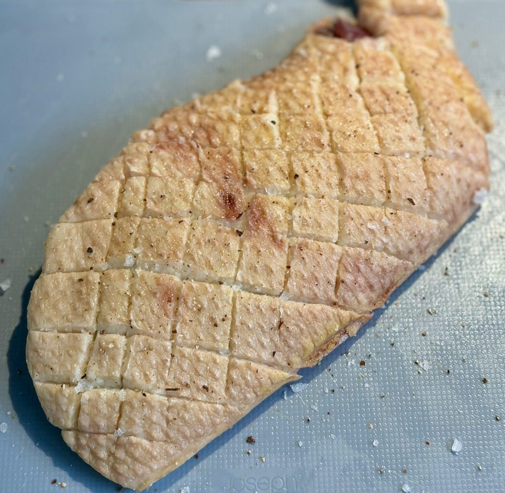 Score the duck breasts skin-side, making sure not to reach the meat. Season both sides with salt and pepper.