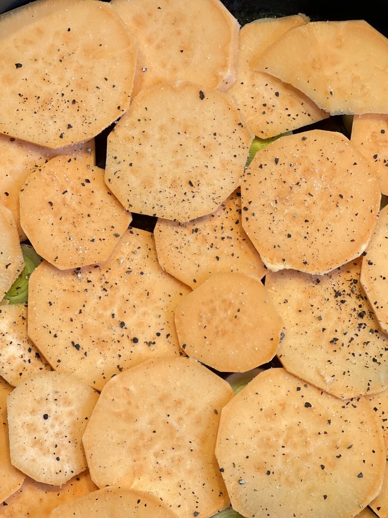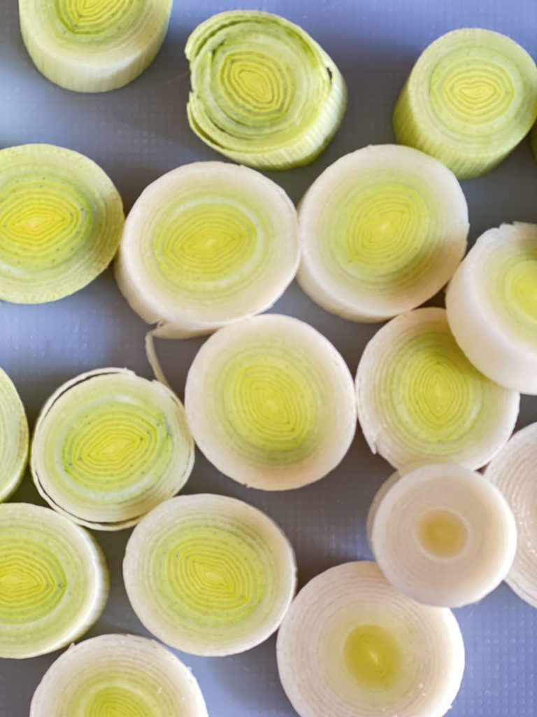 Rinse the leeks and cut them up in slices of 2 cm. Keep the green part of the leeks for stock. Peel the sweet potatoes and cut into thin slices.