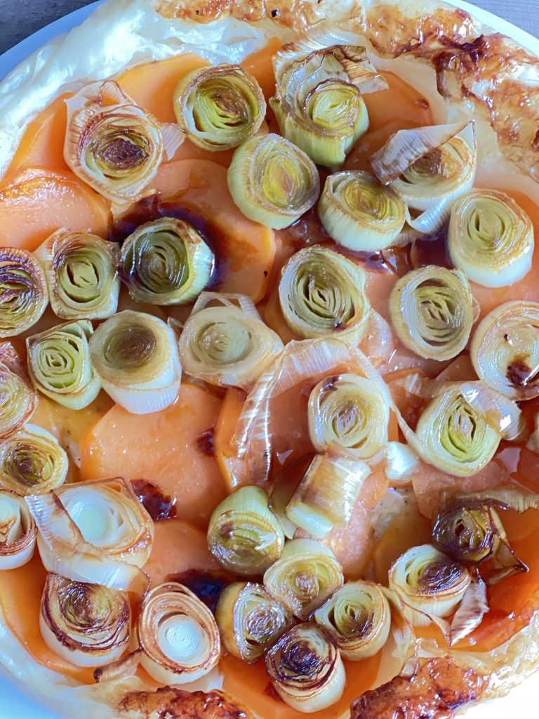 In a deep pan that can go in the oven, melt a knob of butter, add a drizzle of olive oil and runny honey, a table spoon of sweet soy sauce. Place the leeks in the pan and cover them with the slices of sweet potatoes, add some salt and pepper. Lastly, cover the vegetables with the pastry, tuck the side down and scarify the pastry (just a few small cuts).
