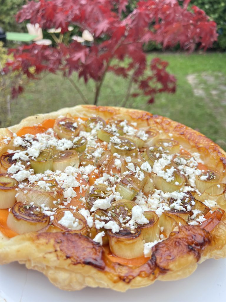 This autumn tarte tatin layers the earthy sweet potatoes with leeks, glazed in sweet soy and honey. Finished with feta, sesame, and zaatar, it balances sweet, savoury, and tangy notes.