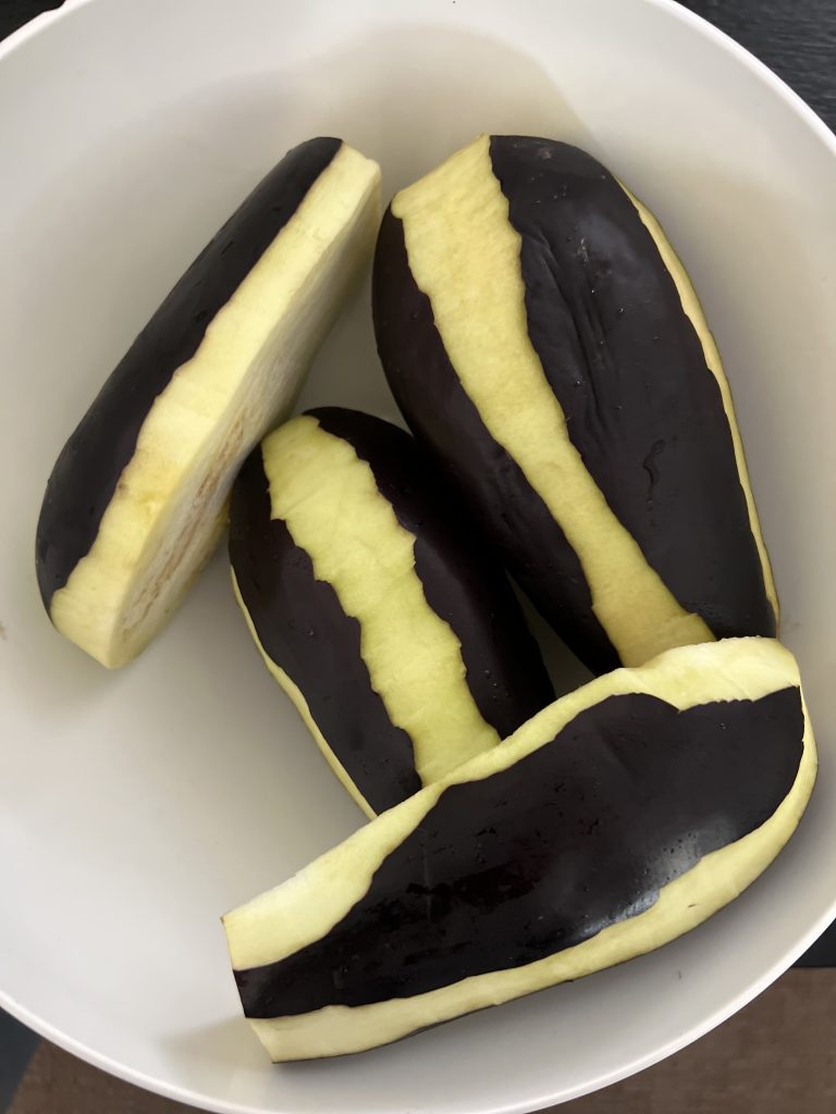2. Prepare the aubergines. Peel them in stripes lengthwise. Then slice the eggplant into 3 slices, cut each slices into medium sized cubes.