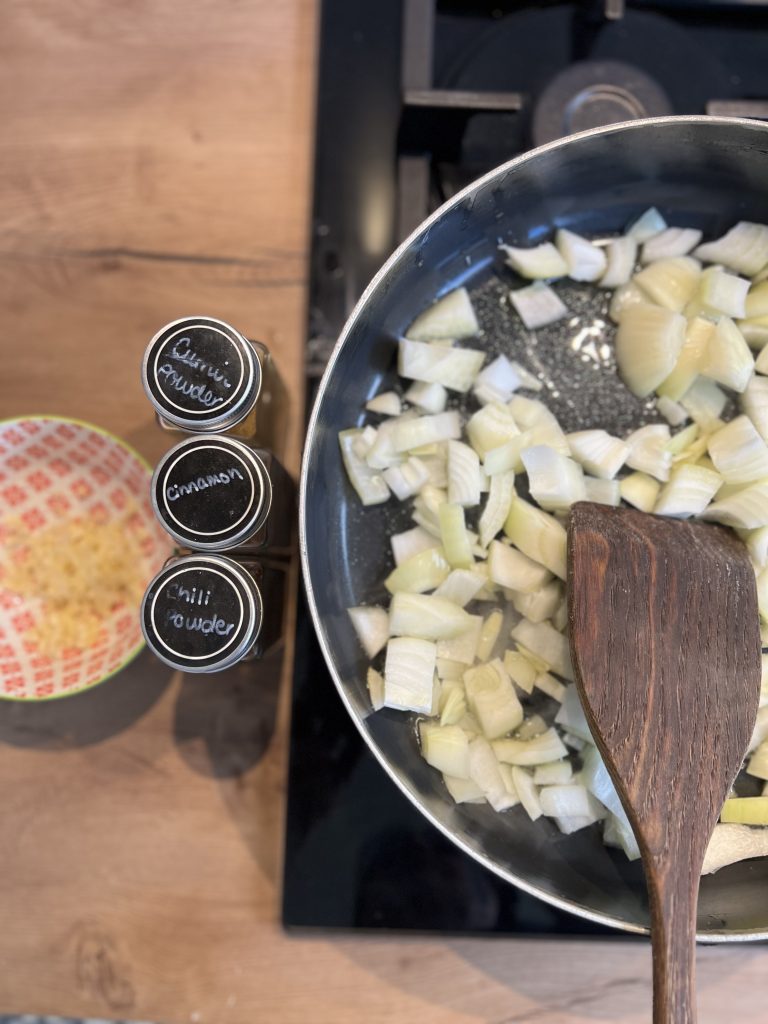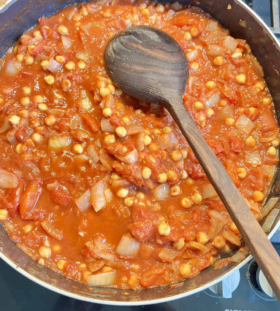 6. Add the oil and onions and cook for 5 minutes until softened. Add the garlic, the chickpeas and all the spices (except the Za’atar) and cook for another 5 minutes.