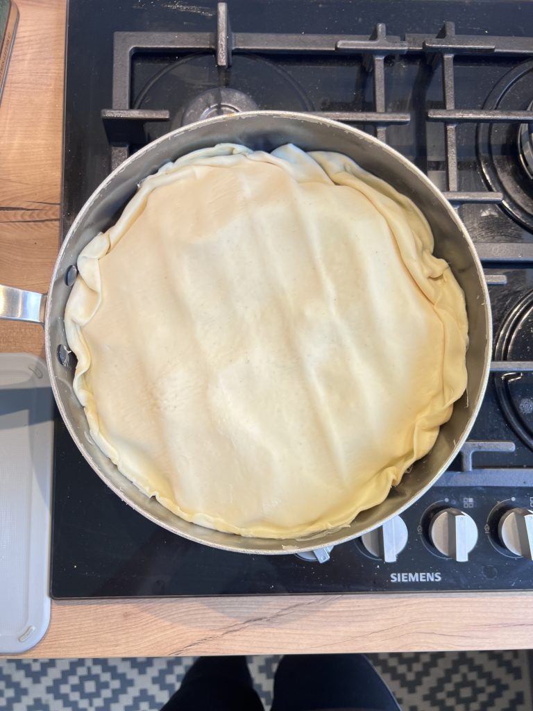In a deep pan that can go in the oven, melt a knob of butter, add a drizzle of olive oil and runny honey, a table spoon of sweet soy sauce. Place the onions in the pan, allow them to simmer for a minute or two. Then cover them with the slices of sweet potatoes, then the slices of butternut squash add some salt and pepper. Lastly, cover the vegetables with the pastry, tuck the side down and scarify the pastry (just a few small cuts).