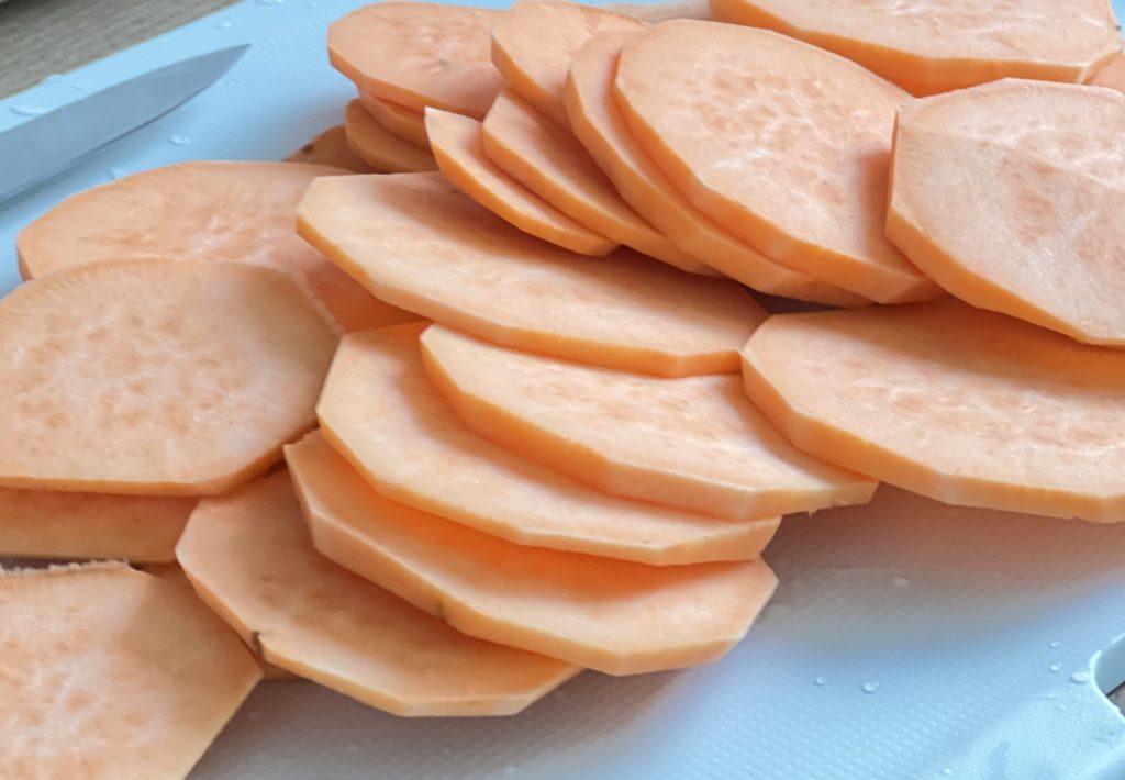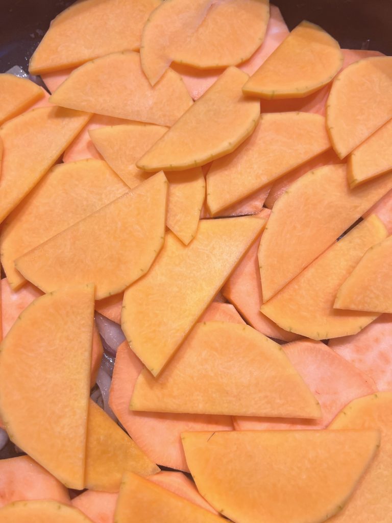 Slice the onions, the sweet potato and butternut squash in fine slices.
